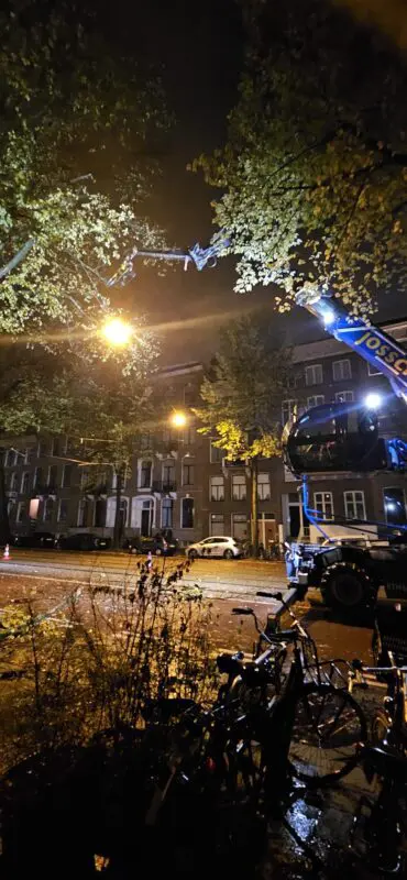 Ook hebben wij ’s nachts een aantal bomen gekapt in het centrum van Amsterdam. Dit moest ’s nachts gebeuren omdat de bomen tussen de tramkabels stonden. Tussen 01.30 en 04.30 uur werden de kabels spanningsloos gesteld zodat wij veilig konden kappen.