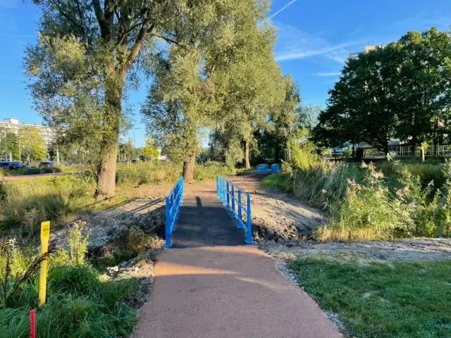 Foto’s: als één van de laatste onderdelen van de werkzaamheden werden twee bruggen geplaatst en wandelpaden aangelegd in één van de parkjes langs de Amstelveenlijn.