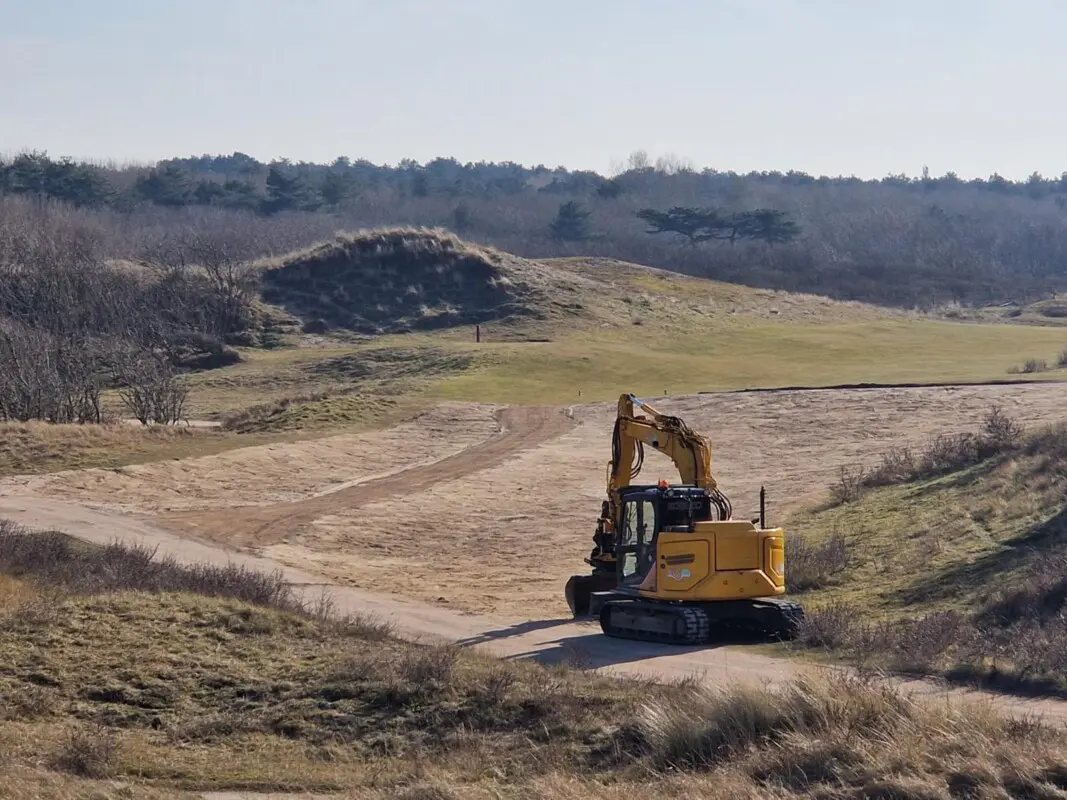 In september 2024 startten we met de eerste fase van de renovatie. Daarbij zijn 800 bomen gekapt en is de zure boslaag over een oppervlakte van maar liefst 50.000 m² tot 20 centimeter diep afgegraven en gezeefd. Het doel: de kalkrijke duinbodem herstellen en de oorspronkelijke landschappelijke kwaliteit van de baan terugbrengen. Tegelijkertijd zijn op meerdere plekken de fairways opgehoogd. Door het gestegen grondwaterpeil waren deze locaties in de wintermaanden onbespeelbaar geworden. Dat is nu verholpen.